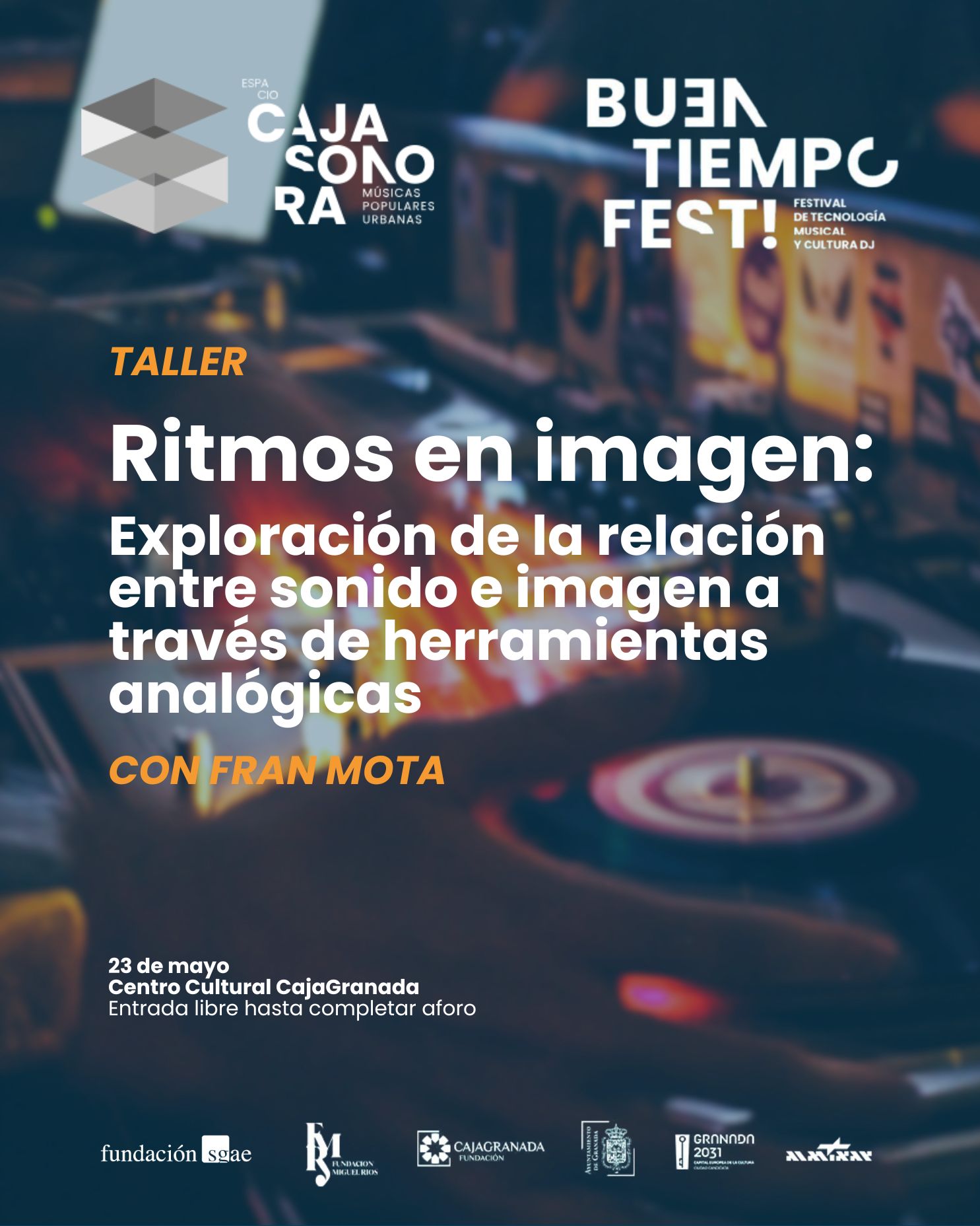 Ritmos en Imagen es un taller práctico y experimental que invita a explorar la relación entre sonido, ruido e imagen a través de herramientas analógicas de vídeo y síntesis sonora. La actividad se desarrollará el viernes 22 de mayo en el marco de Buen Tiempo 2026, festival dedicado a la tecnología musical y la cultura DJ, y será de acceso libre hasta completar aforo.